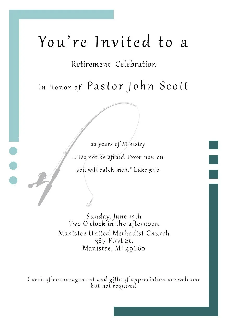 Retirement Celebrationfor Pastor John Scott Sunday, June 12, 2022 11:00 AM 12:00 PM Manistee United Methodist Church 387 First St 49660 United States (map) Google Calendar ICS